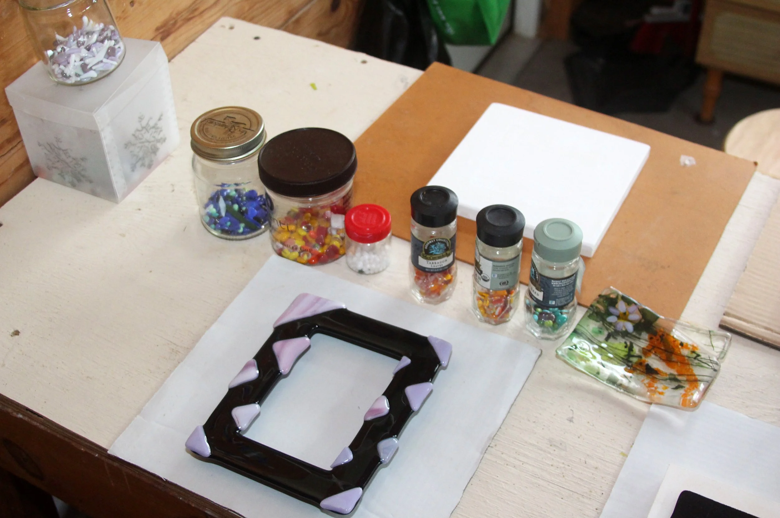 Working from a converted barn studio in Winfield, Johnson creates bowls, dishes, picture frames, ornaments, and decorative wall art that celebrate color and texture. Each piece begins as carefully selected sheets of glass layered and fused together through heat, allowing patterns to evolve organically during the firing process. The result is a collection of handmade objects that balance artistic expression with everyday practicality — pieces designed not only to be admired, but also to be lived with and enjoyed.