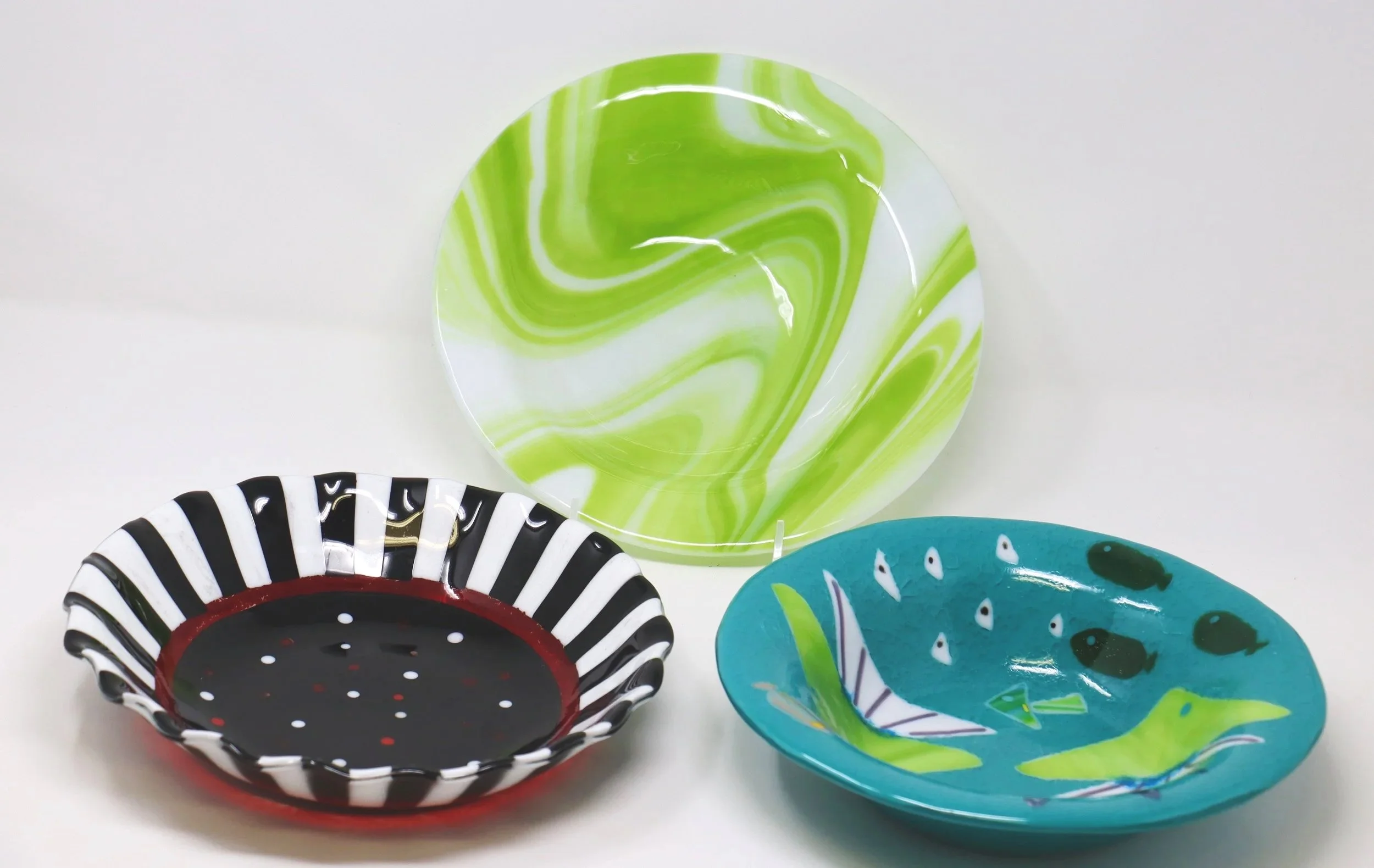 Johnson first began experimenting with fused glass in the 1990s after taking classes with friends, eventually building a dedicated studio equipped with multiple kilns to support her growing creative practice. Over time, her style has developed into a recognizable blend of bold color, nature motifs, and functional design. From ocean-inspired fish and wildlife imagery to abstract swirls of opaque and transparent glass, her work reflects the movement of water, the rhythm of the outdoors, and a love of storytelling through materials.